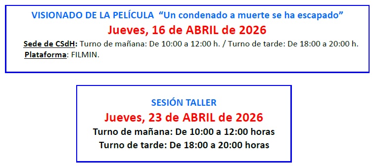 Para inscribiros, podéis hacerlo desde hoy y hasta completar el aforo (30 socias/os por sesión) en el botón de REGISTRO siguiente o en el formulario enviado por Whatsapp o con un mensaje en el grupo de WhatsApp indicando, como siempre: Taller de Cine, nombre y apellidos, y si os apuntáis al turno de la mañana o de la tarde