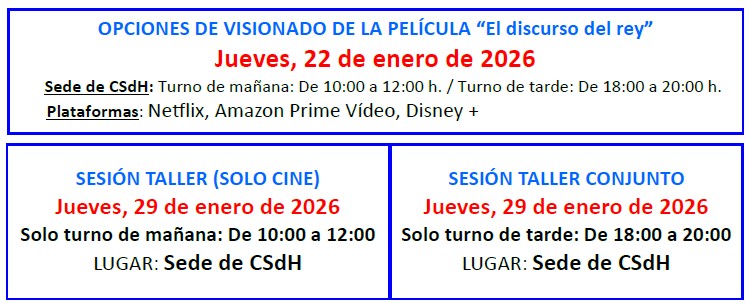 Comenzamos el año con un taller especial de Oratoria y Cine en torno a la película El discurso del rey. A través de esta inspiradora historia, reflexionaremos sobre el poder de la palabra, la superación del miedo escénico y la importancia de la comunicación auténtica. Una experiencia para disfrutar del cine y mejorar la forma de expresarnos.